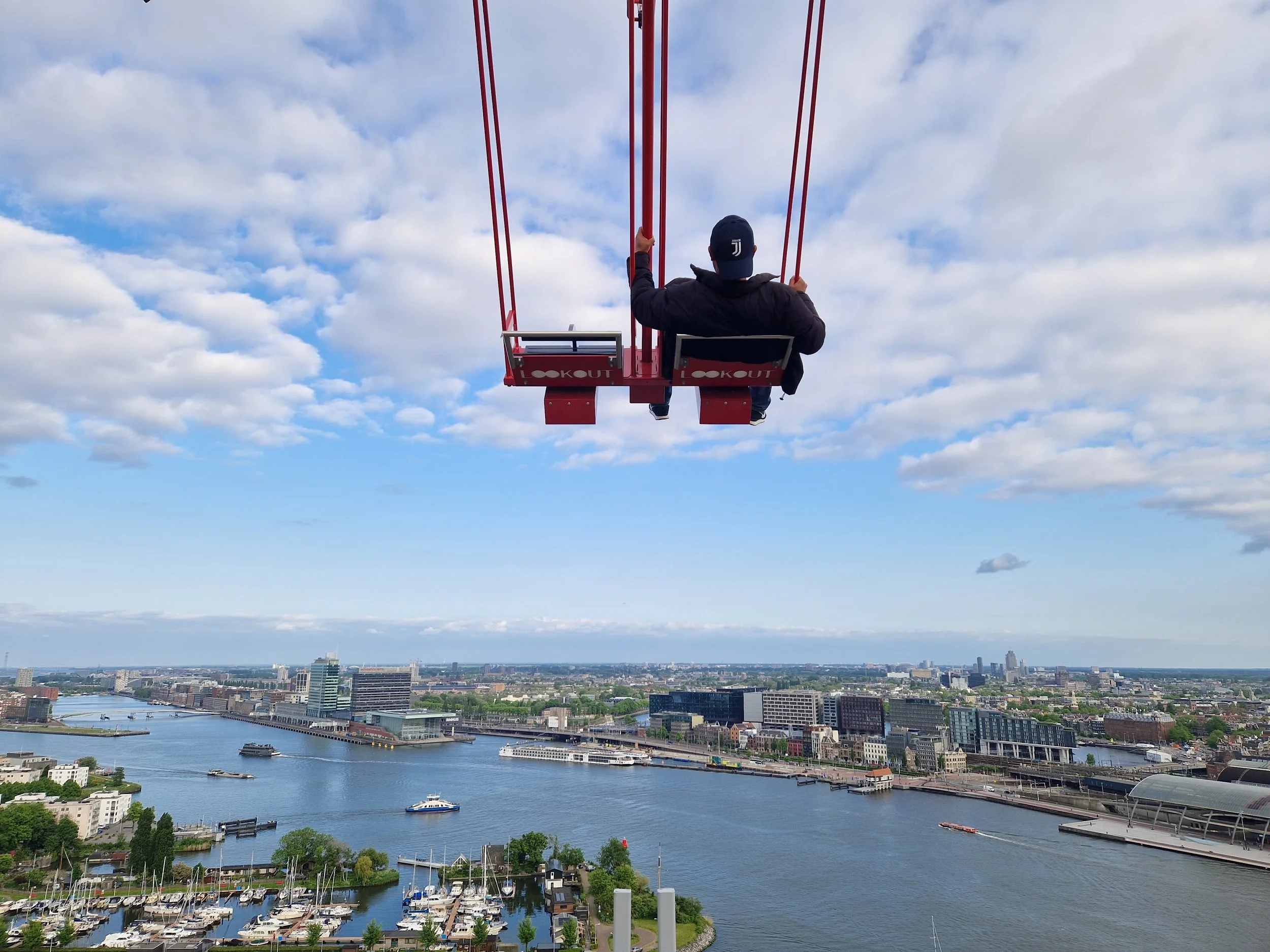 I went back to the swing to overcome my fear, and the best part is that God offered me this opportunity for free. This time, though, I didn't close my eyes and thoroughly enjoyed the journey. Saw the ferries, roads, vehicles, buses, wide sky, Amsterdam Central Station, and more...